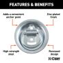 Making sure that your cargo is tied down and fully secure for the journey is important for any towing job. Not only is unsecured cargo a danger to you, your passengers and your fellow drivers, but it can also cause damage to your trailer, pickup truck bed or vehicle cargo area, as well as to the cargo itself. Together with our cargo straps and safety chains, CURT tiedown anchors are easy to mount in any trailer, truck or full-size van, and they help keep your items safe for the road ahead. This particular tiedown anchor is a recessed tiedown ring, designed to add a convenient anchoring point for cargo straps, ropes or cables. It comes with a 3-1/2" diameter base and two mounting holes. The recessed feature allows it to remain flush with the base and out of the way when not in use, making it especially useful for truck beds and passenger vehicles. It is specifically designed to mount on 1/4" plywood and can also be used with the tiedown backing plate trim ring #83720 for a more finished appearance. This rope ring features zinc-plated steel construction and offers a working load capacity of 1,000 lbs. (1,000 lbs. break strength). Mounting screws are not included in this package.