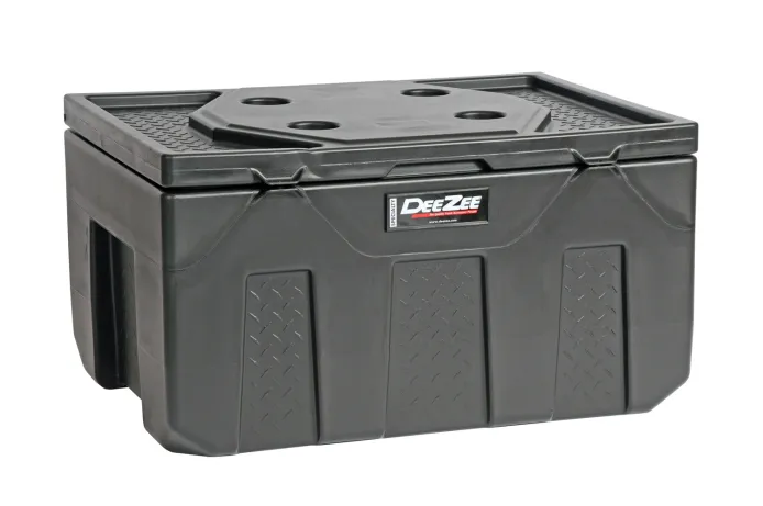 Dee Zee Tool Box - Plastic poly utility chest. Constructed of strong yet lightweight plastic. Built to add quick storage wherever you need it. Truck, trailer, boat, dorm room, garage, barn, workshop or anywhere else you can use storage. Molded cup holders on lid provide convenience. Foam gasket around lid helps makes box weather resistant. Built in locations on lid accept your pad lock for security (pad locks not included).