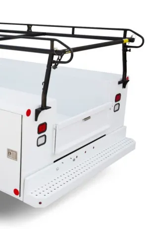 Rear leg mount brackets attach to the rear panel of the body. Brackets relocated at the reinforced outside corner of the box where they can be raised or lowered without hitting tail lights. The height of the rack over the cab can be optimally set for allmakes and models of truck or service body. Mount brackets set the legs off 5/8" from the rear panel to accommodate top opening boxes. Add side channels for complete rack. Includes bulkhead support and improved rear mount.