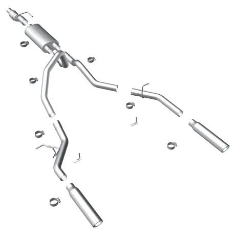 The MagnaFlow Ford F-150 Street Series 15087 brings out the personality of your 3.5L 2011-2014 Ford F-150 with our signature resonant, powerful engine tone and dyno-proven performance. Thanks to its fast-flowing, mandrel bent 3in. main piping and 1 Straight-Through mufflers ending in a Dual Split Rear exit with 3.5in. Polished Clamp-On-Single Wall-Angle Cut-Rolled Edge tips, this Ford F-150 exhaust kit has the performance chops to match its sporty sound and appearance. Upgrade your ride to the next level with an exhaust that has the pipes to put other Ford F-150's to shame. With this system your vehicle will be producing Agressive exterior and Moderate interior sound levels while leaving other cars and trucks feeling envious at every stoplight. Exhaust kit 15087 features a cat-back layout that replaces your ride's stock exhaust components from near the catalytic converter on back. Extensive 3D scanning during development has resulted in a direct-fit design that you can easily install yourself. 15087 is produced using CNC precision robotic manufacturing techniques and is backed by MagnaFlow's 1-year limited finish warranty and limited lifetime construction warranty.