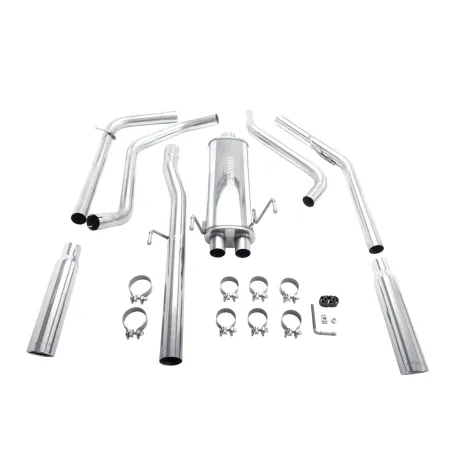 The MagnaFlow Dodge Ram 1500 Street Series 16851 brings out the personality of your 5.7L 2008-2008 Dodge Ram 1500 with our signature resonant, powerful engine tone and dyno-proven performance. Thanks to its fast-flowing, mandrel bent 3in. main piping and 1 Straight-Through mufflers ending in a Dual Split Rear exit with 3.5in. Polished Clamp-On-Single Wall-Angle Cut-Rolled Edge tips, this Dodge Ram 1500 exhaust kit has the performance chops to match its sporty sound and appearance. Upgrade your ride to the next level with an exhaust that has the pipes to put other Dodge Ram 1500's to shame. With this system your vehicle will be producing Agressive exterior and Moderate interior sound levels while leaving other cars and trucks feeling envious at every stoplight. Exhaust kit 16851 features a cat-back layout that replaces your ride's stock exhaust components from near the catalytic converter on back. Extensive 3D scanning during development has resulted in a direct-fit design that you can easily install yourself. 16851 is produced using CNC precision robotic manufacturing techniques and is backed by MagnaFlow's 1-year limited finish warranty and limited lifetime construction warranty.