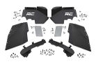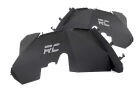 Clean up the look of your inner fenders when using aftermarket flares with Rough Country's JK Front Inner Fender Liners. This eye-catching inner fender upgrade helps protect your engine bay from dust, mud, and debris, and can be easily installed in no-time flat! Aftermarket fenders are a huge improvement for most Jeeps wanting to get the best clearance and articulation possible, but when removing the stock fenders many people also remove the stock fender liners. Regain protection in this crucial area and protect your engine bay from the elements with Rough Country's innovative Front Inner Fender Liners. With a unique 3-piece construction, these liners cover more areas than other liners on the market, giving more protection to your engine bay and body panels. Each Rough Country liner features a corrosion-resistant powder coat for long-lasting durability. Additionally, these liners mount firmly to the body for quiet operation, free of rattling or vibration noise. The solid-steel, angular design with GRC" logo cutout gives an aggressive look to this now more visible area on your JK. An included, removable logo plate can be custom painted to any color you wish for a pop of extra color. Rough Country Inner Fender Liners feature a bolt-on installation process with minor drilling for an easy upgrade you can do with common tools in a home garage. Includes Rough Country's Lifetime Replacement Warranty.