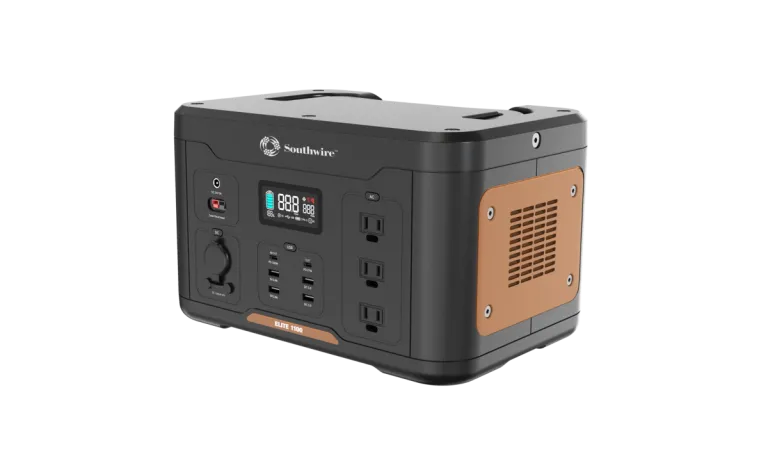 PORTABLE POWER STATION 1100 WITH 1166 WATT-HOURS OF POWER, FEATURES PURE SINE WAVE, 6 USB PORTS, 3 AC OUTLETS, 12V DC OUTLET. FOLDING HANDLE
